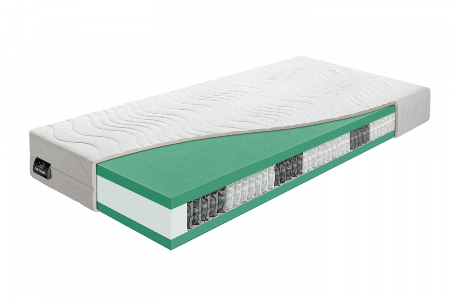 Zloženie: BIO 40kg/m3 pena 4 cm (zelena), taštičková pružina multipocket 650 ks/m2 – 7 zon, BIO 40kg/m3 pena 4 cm (zelena)