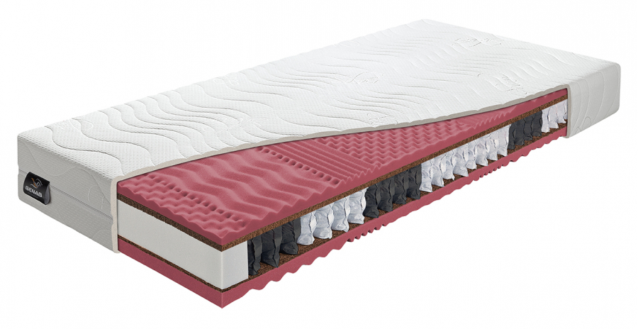 Použitý materiál PUR pěna 35kg/m3, kokosová vrstva 1300 gr/m2 1+3cm, taštičková pružina 250 ks/m2 – 7 zon