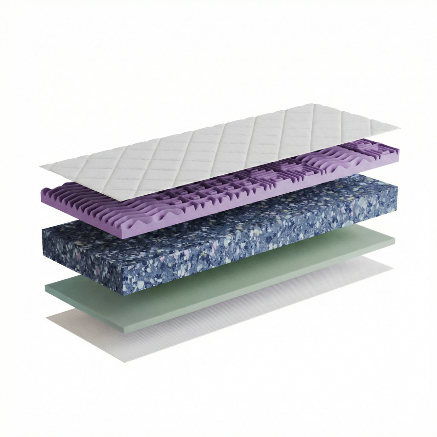 POE/RE PENA * Material * RE pěna je recyklovaná drcená polyuretanová pěna a vyrábí se spojováním různých materiálů pod silným tlakem. RE pěna dodává matrací vyšší tuhost a tedy i nosnost.