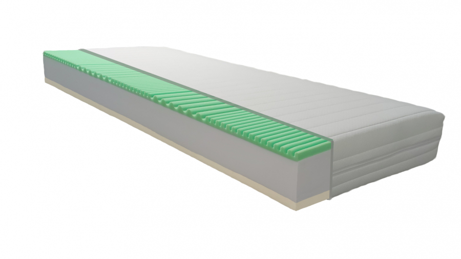 Použité materiály zaručujú optimálnu oporu tela, dlhú životnosť a vysoký komfort – VISCO pena 55 kg/m³, PUR pena so 7-zónovým profilom 35 kg/m³ a PUR jadro 35 kg/m³.